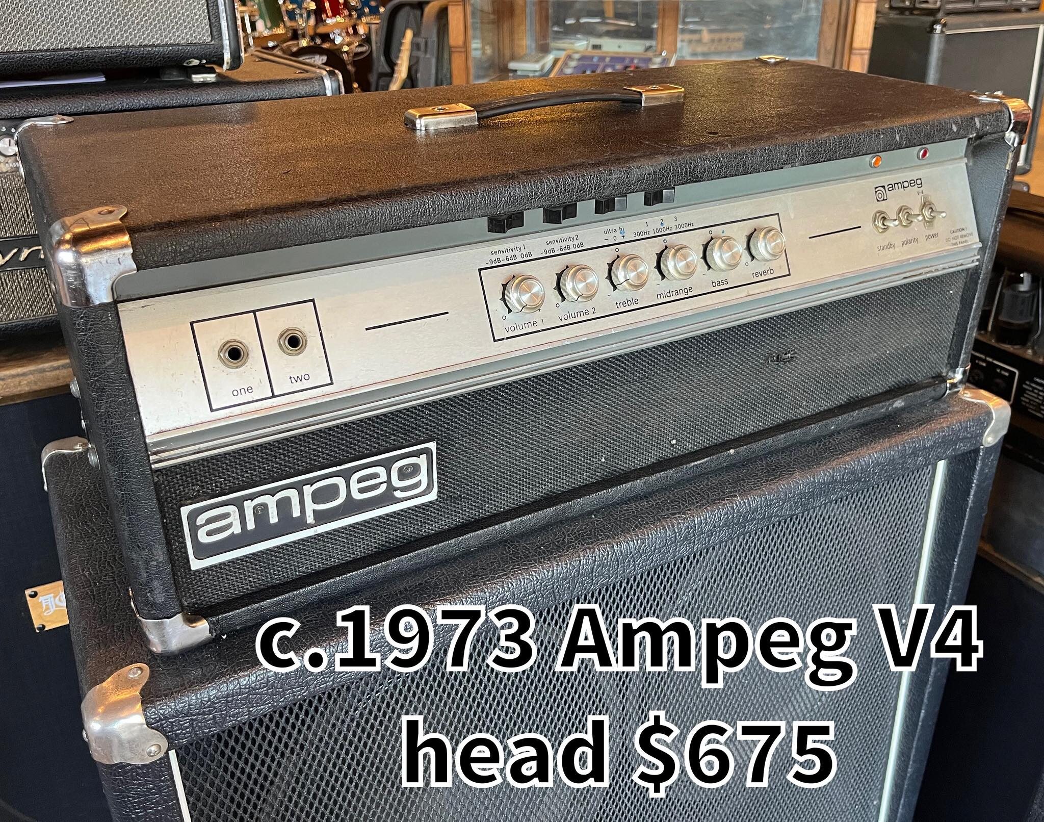 - c.1973 Ampeg V4 head – $675 Previous owner replaced handle and grill cloth.